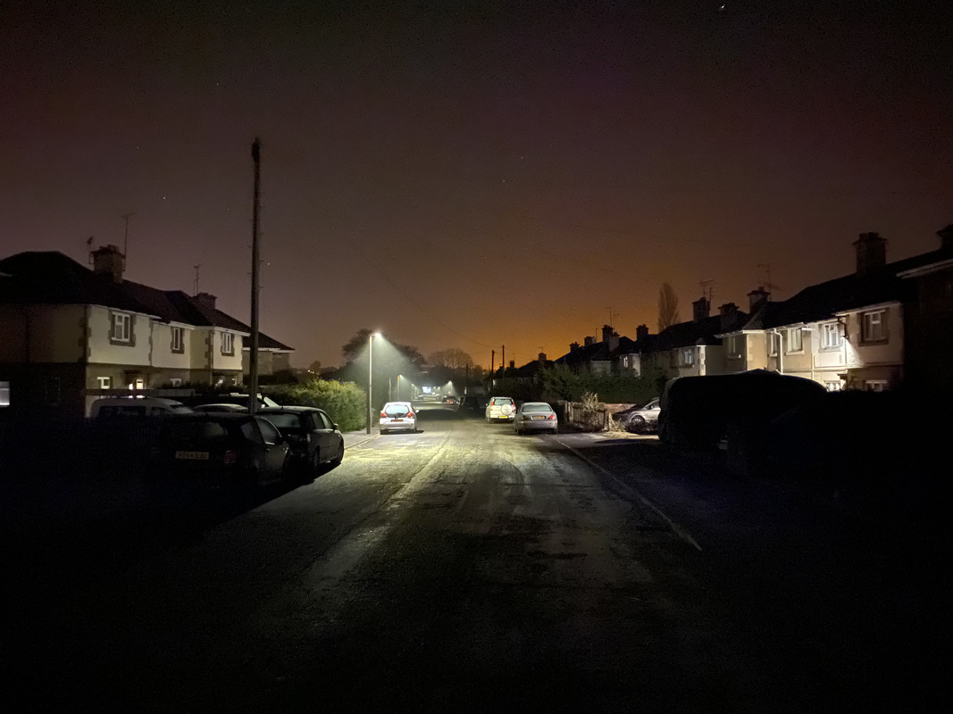 This is a quick shot I took down my road around midnight, the old nasty orange lights have been replaced with LED’s, but to my eyes the road is quite dimly lit - not to my phone it isn’t.