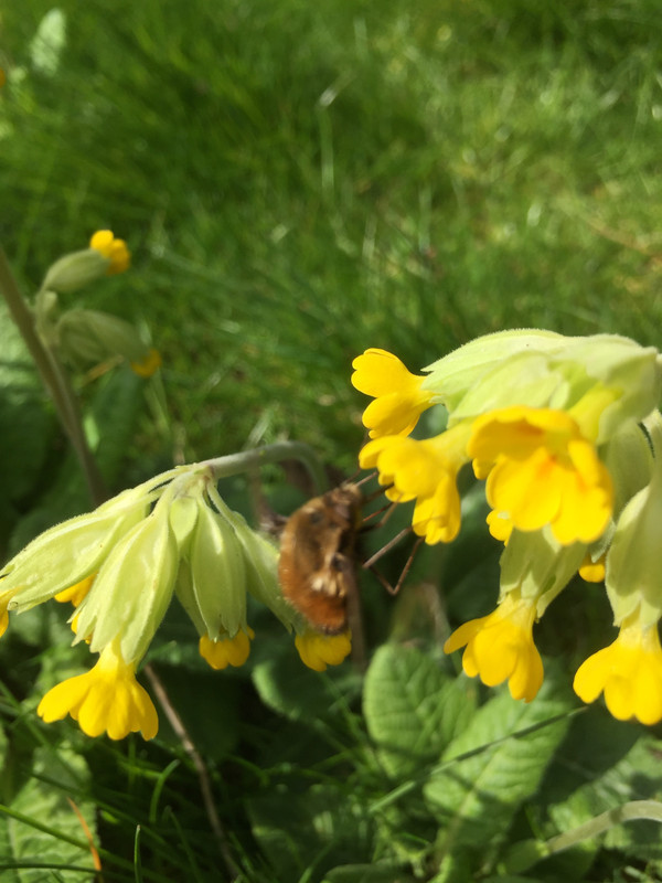 Quite a few bees of various types around the garden at the moment, the Acer is in flower, and I’ve got a shitload of cowslips out which they seem to like. There’s also a bee fly around which hovers in front of the cowslips and pokes a long proboscis into the flower. I thought it might be a hummingbird hawk moth, but it’s a type of fly.