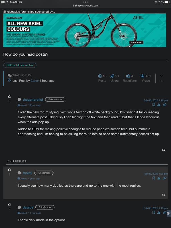 Fwiw, this is how the forum looks on my iPad - I’ve no idea what it’s set to, ie dark mode or whatever, because I’ve no recollection of having changed anything on it. When I open the forum, it looks like this, regardless of whether I’m using it in daylight or at night with very little ambient light.