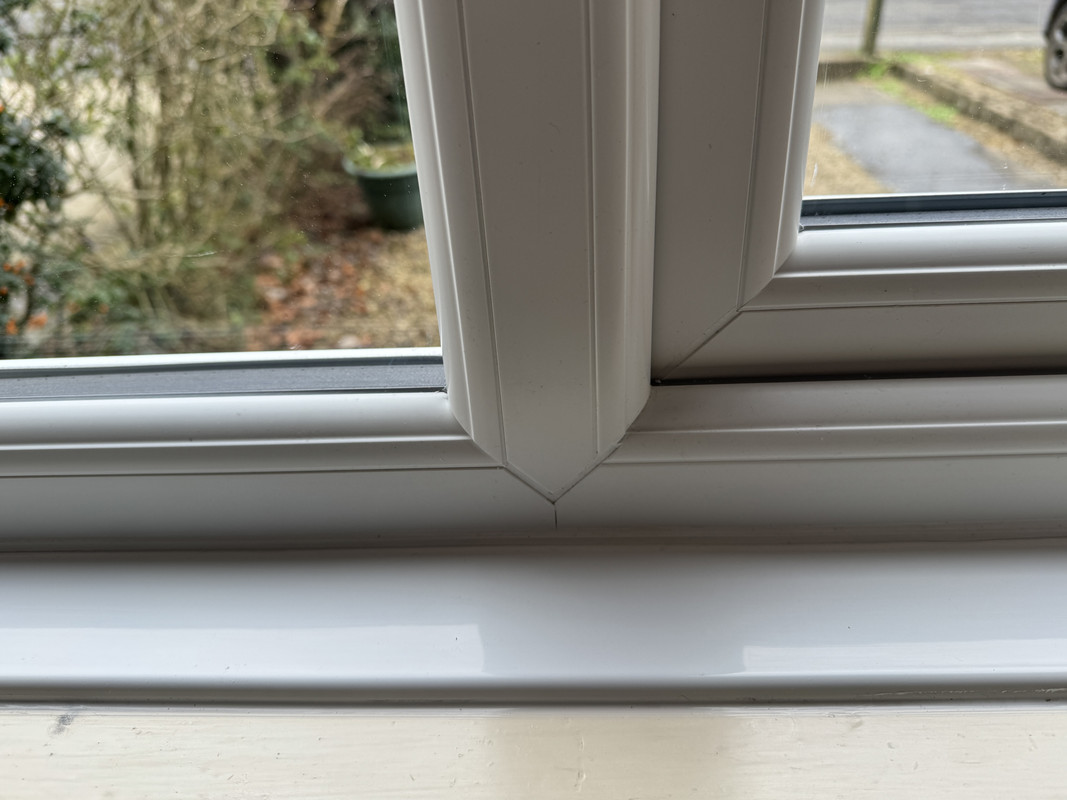 I have relatively new windows (<10 years old), standard uPVC double glazed. I have just noticed that water is getting inside (see pictures below). Weirdly, the water seems to be seeping in from one of the joins rather than a seal. How on earth is it doing this? The joins on the outside of the frame appear to be sound. I have never seen this sort of frame leak like this. Thank you!