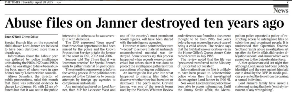 The fact is, this whole issue has been running for some time~ Janner is not an isolated case and Special Branch are said to have intervened in many similar cases...
