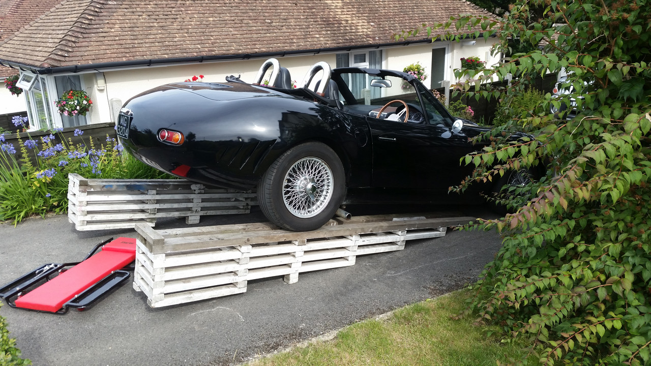 I made these ramps out of cheap timber. You drive until your wheels hit the stop. You have quite a lot of height to work under at one end that way. If you want the whole car up then you jack up the other end of the ramp and chuck a couple of breeze blocks under it giving you space to work.