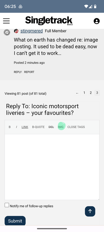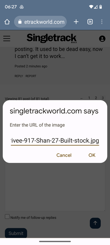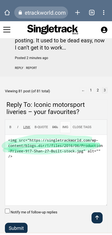 I learned this from @scotroutes so thanks 😁. I use postimage - select image to upload, from the share option select 'hotlink for forums', copy that and just paste into the text box of your post. No need for anything other than that. Don't need any of the options on here above the text box, just paste that hotlink in and Bob's your Auntie's live-in lover. HTH