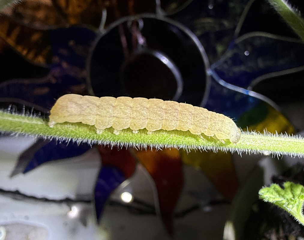 Just noticed what looks like a caterpillar of some sort, on a Pelargonium I’ve got on the kitchen windowsill. iOS can’t identify it, and I’d like to know if it’s something that I could allow to keep eating holes in the leaves, or chuck it outside to leave to its own devices.