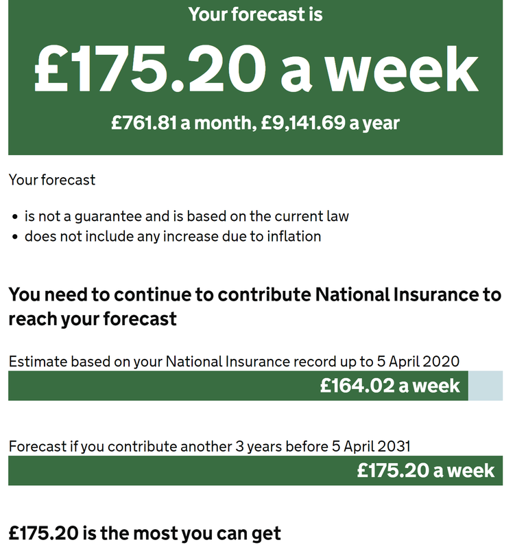 Just been to check. A whopping £175.40 a week after another 6 years of contributions. Should be able to manage that over the next 21 years.😒
