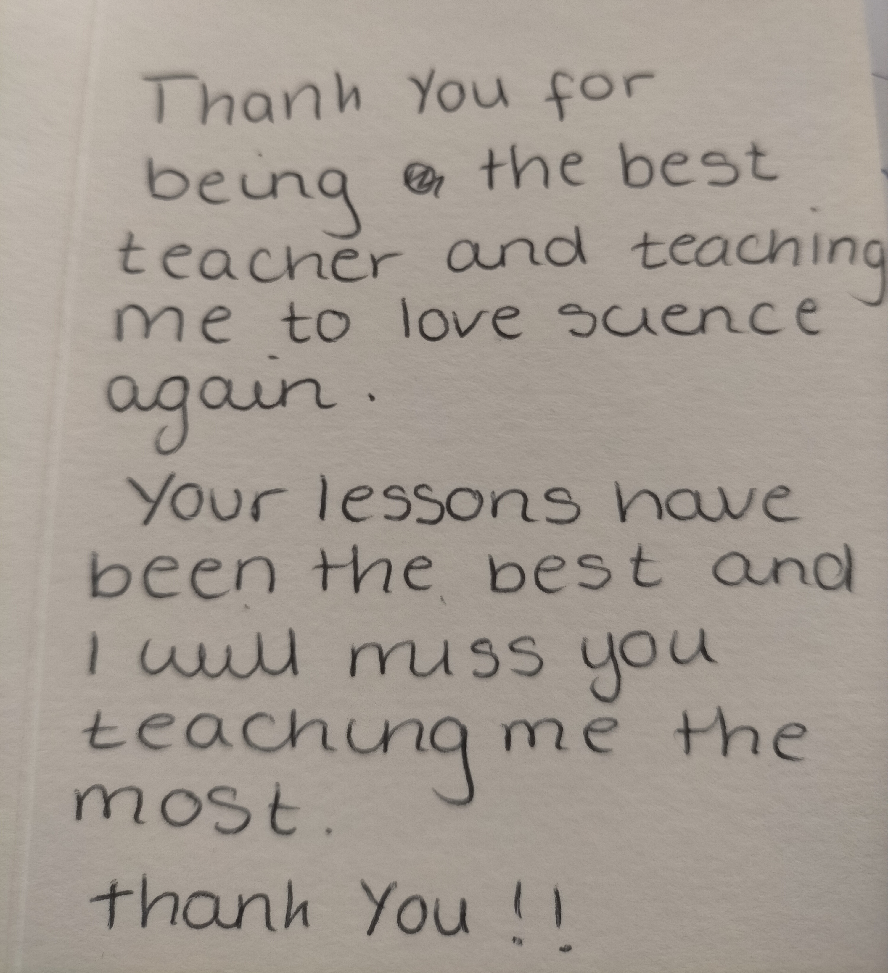 A card from a year 11 student this year saying "eres un profesor increíble" and thanking me, saying she thinks she will get a great grade. Was a bit dusty in my classroom when I opened that.