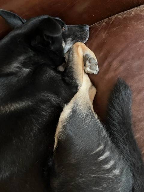 Sally is quite protective of her personal space. There is no way she'd ever allow another dog to do to her what she is doing to Jerry. But when she needs to be in a particular spot...