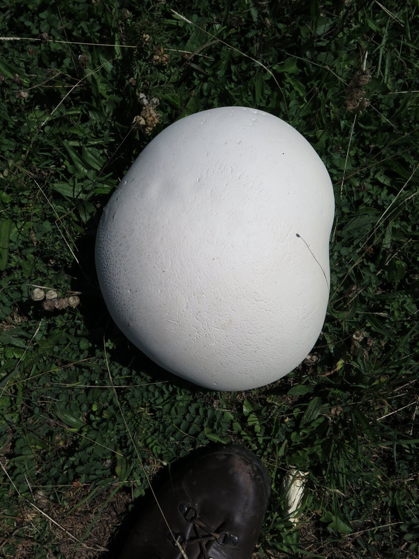 Yeah, as mentioned, it's a giant puffball. They can easily get to basketball size. Something has had a good nibble on that one already but if you're keen to eat it then slice through the middle to make sure it's pure white all the way through. If it's at all yellow then I'd not bother eating. The yellowing means they're starting to produce spores which can cause tummy upset.