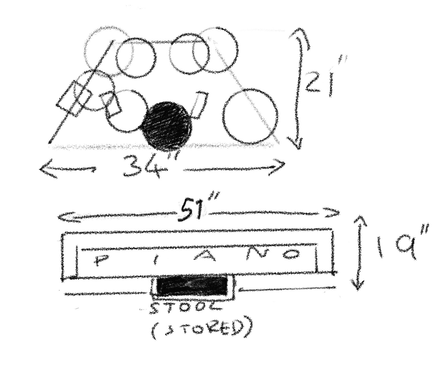 If this is at all useful to anyone I just quickly measured both the piano and drum kit (with stool/throne tucked under) to give some idea of space required