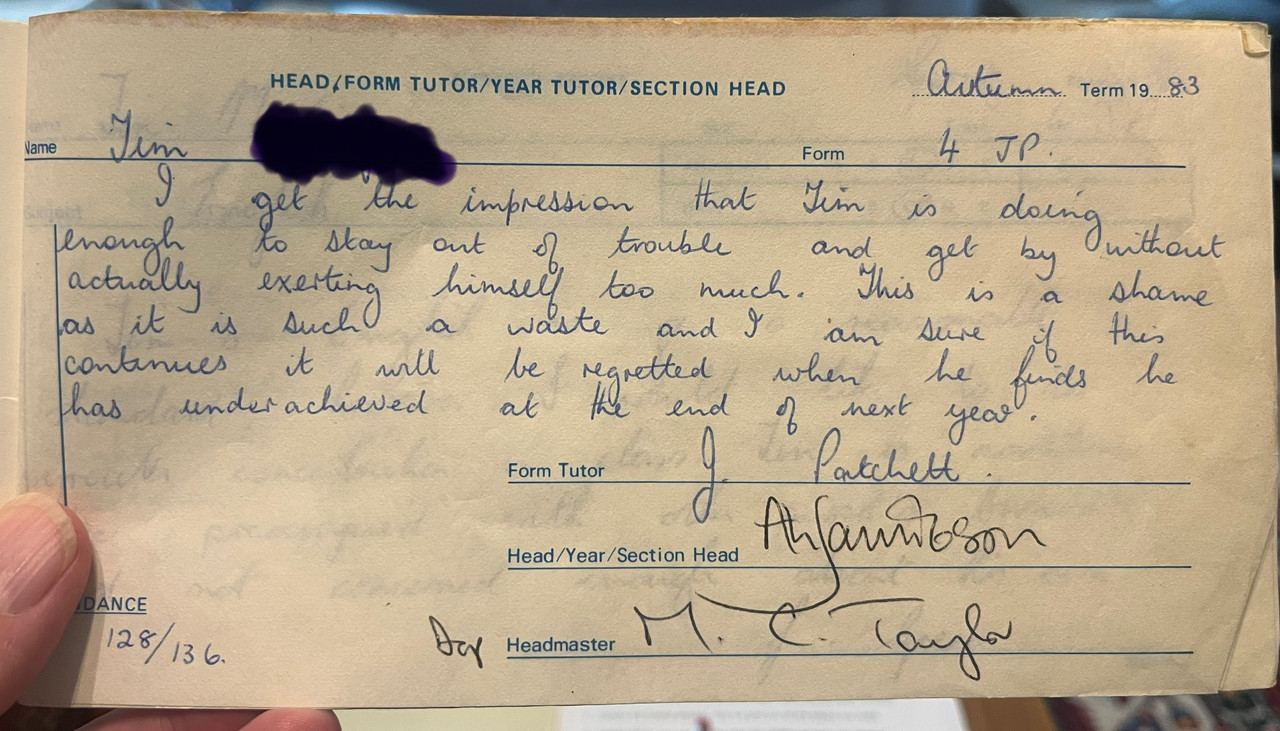 No idea where my school reports are and I doubt they were kept or if I even received any, I went to 5 primary schools and 4/5 high schools/academy’s and can’t remember any from high school.