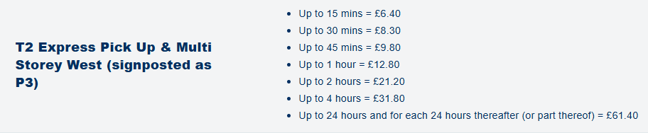 - Up to 15 mins: £6.40 (Maximum stay for Express Pick Up)