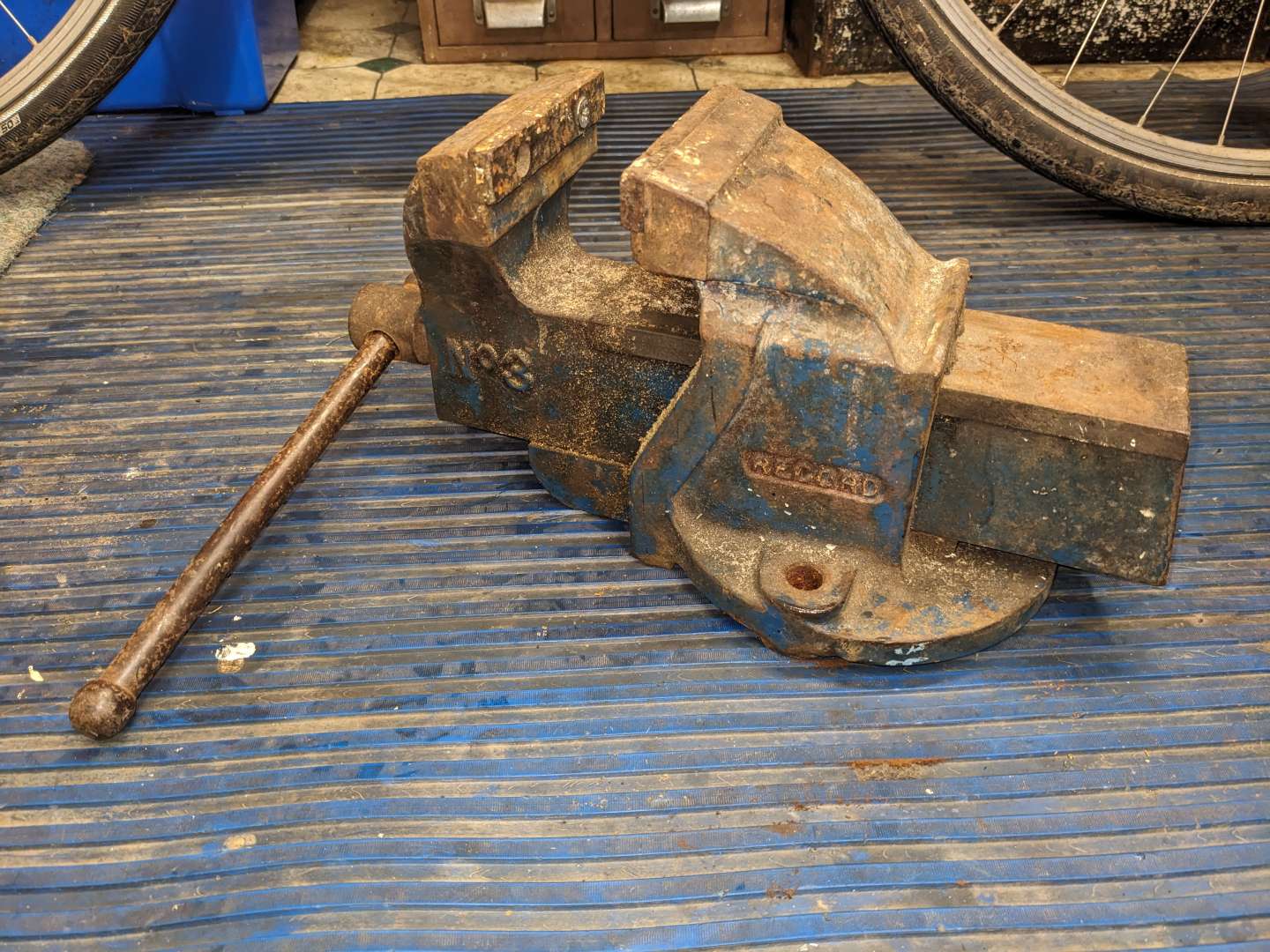 If it was like mine was, where it had been slathered with all sorts of grubby paints of different types, so the paint was filthy and cracked, I put a wire brush on a whizz wheel, protective glasses and stripped all the crap off then hand painted it with Hammerite blue, which is as close as makes no difference to Record blue.