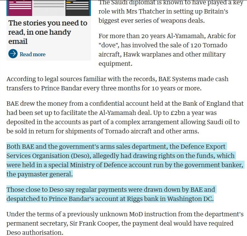 [b]'According to legal sources familiar with the records, BAE Systems made cash transfers to Prince Bandar every three months for 10 years or more.[/b]BAE drew the money from a confidential account held at the Bank of England that had been set up to facilitate the Al-Yamamah deal. Up to £2bn a year was deposited in the accounts as part of a complex arrangement allowing Saudi oil to be sold in return for shipments of Tornado aircraft and other arms.