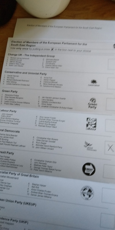 I usually vote Green but I voted Lib Dem to (hopefully) count as a definite remain vote. I was properly torn when it came to actually cast my vote though, me and my OH had a full-on moral dilemma going on outside the polling station before we'd decided what we thought was 'best' in this instance 😆 Not being able to beat Farage to a bloody, quivering pulp, putting an 'X' in a box will have to do...