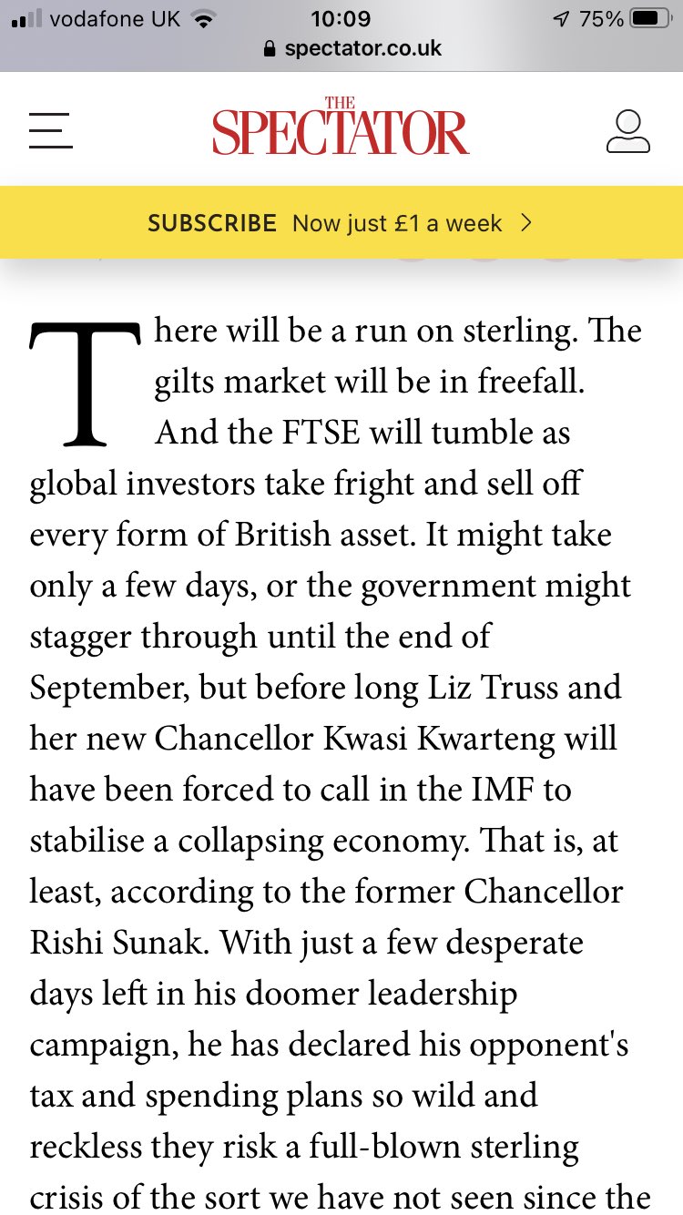 Feels like we are already approaching the death spiral of the Lawson boom of the 1980s/early 90s, but without enjoying the boom bit first. Conservatives perhaps have forgotten that these 'dash for growth' policies normally result in lost elections, unless they are counting on the relative weakness of Labour allowing them a narrow John Major-style win in 2024.