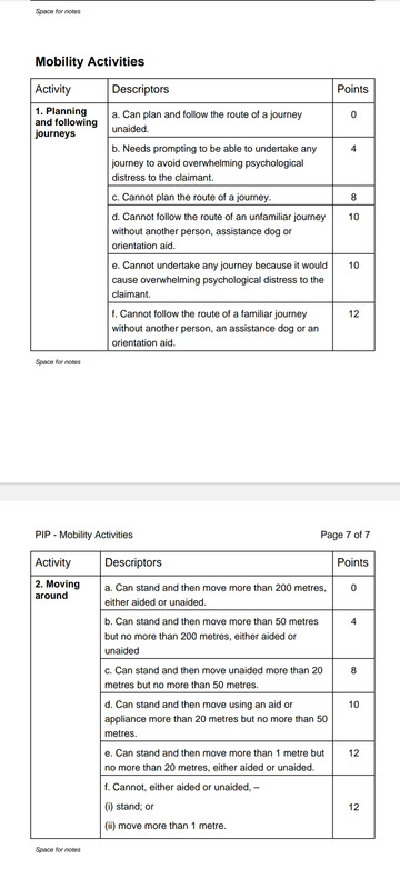 As someone who qualifies for a motability car I thought I'd post the criteria you need to meet to get higher rate mobility. From the following tables you need to score 12 points to qualify, so it's not a picnic being disabled enough to qualify.