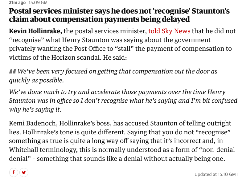 Private Eye really going for the jugular now when it comes to the cosy threesome between Fujitsu, the Post Office and this government. Doesn't look like they went out of their way to find a Post Office Minister with no links to Fujitsu.