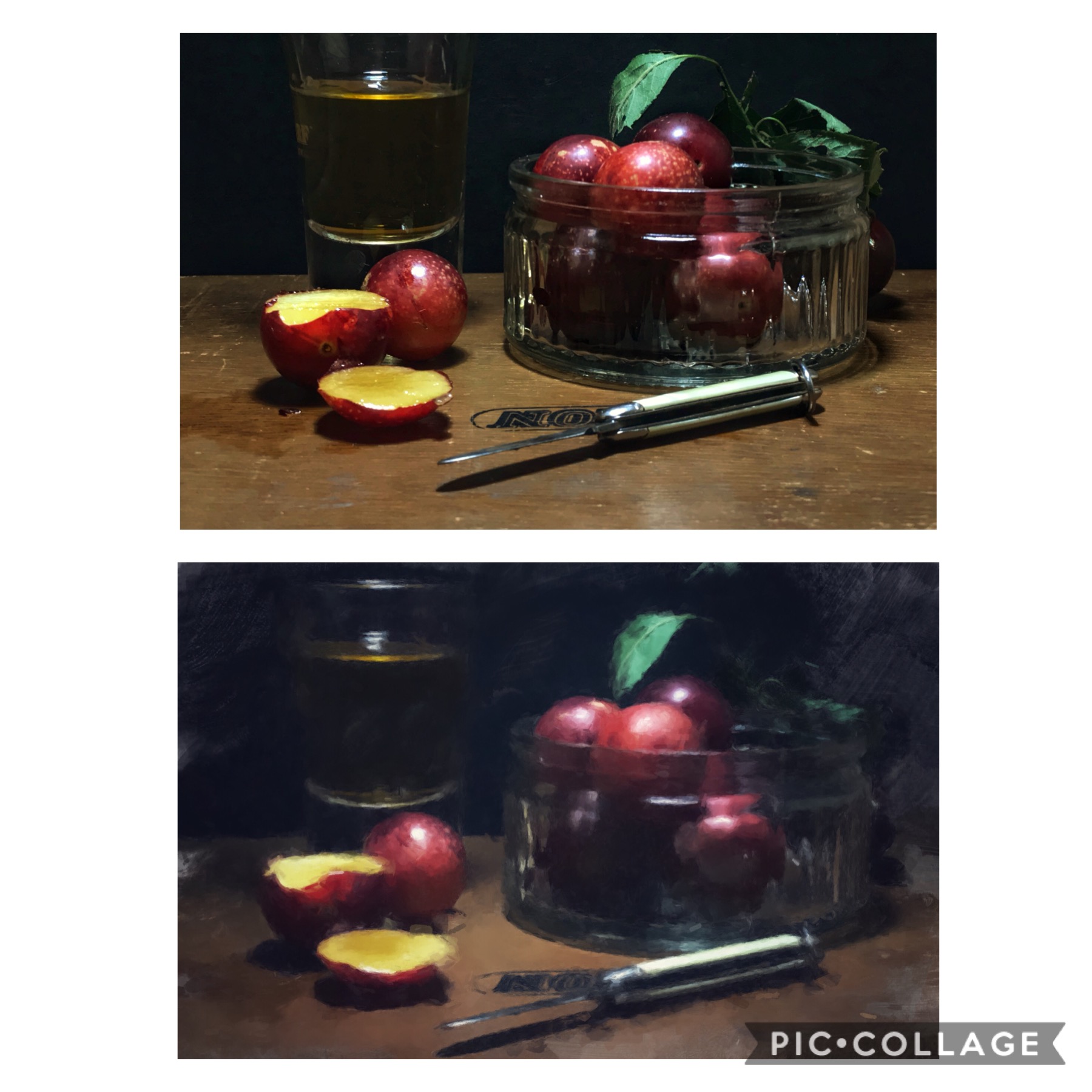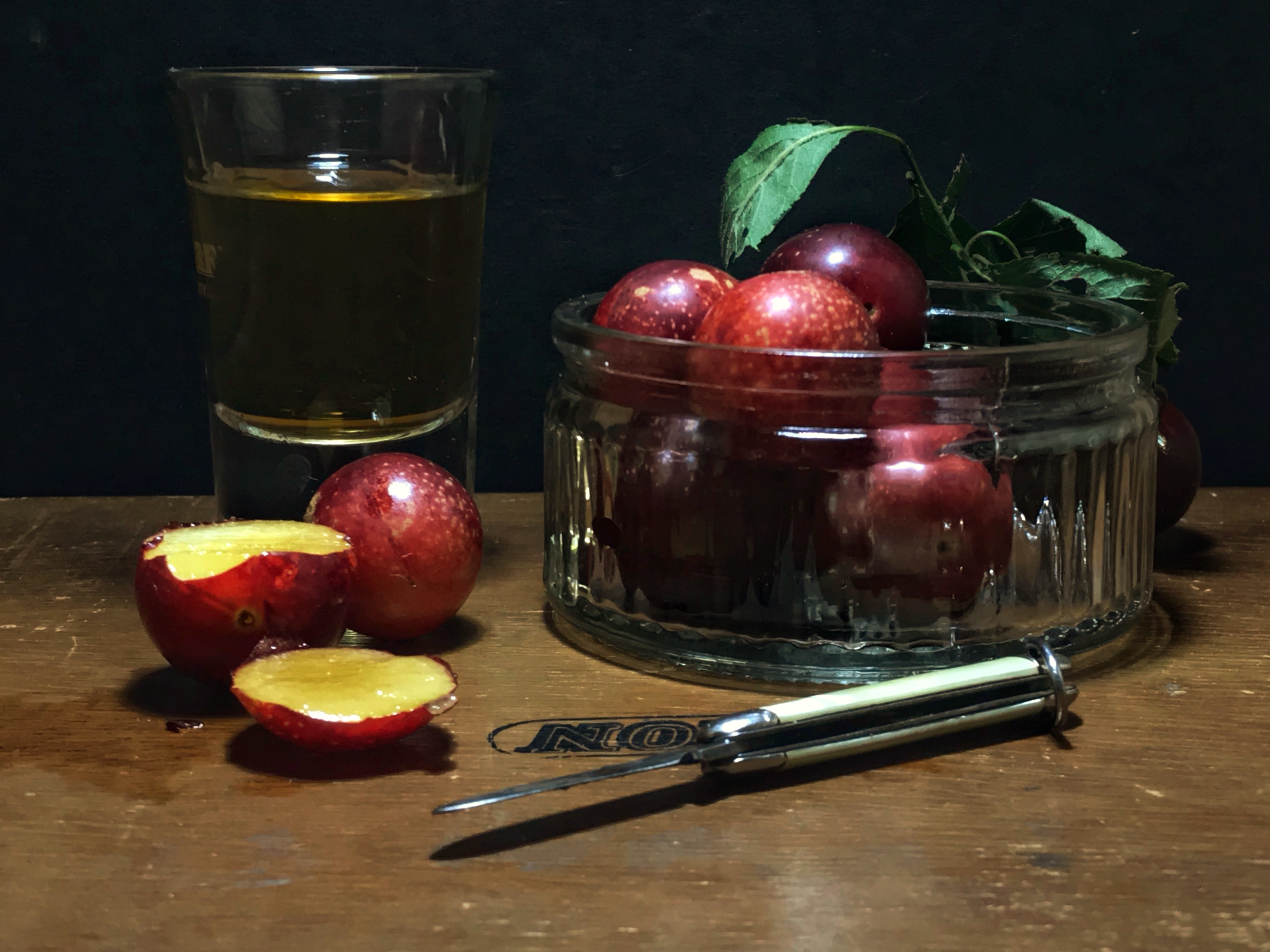 In the interests of art and science 🥃🍒 - here is my original source photo (from last autumn). Yes I had to go and collect those wild ‘cherry’ plums, construct a tabletop studio with adjustable daylight-spectrum lighting, arrange the still life, take pic, post-process etc.