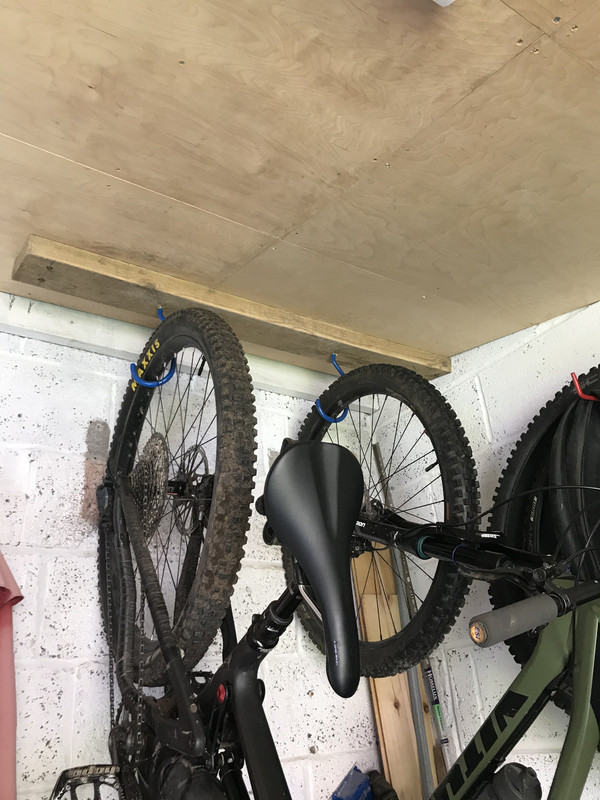 One thing I find invaluable is long wall hooks, about 8 inches. Bit of pipe lagging on them and they’re great for hanging spare wheels and tyres. Mounted above where the bikes sit, so use wasted space and one for each wheel size makes tyre selection much easier.