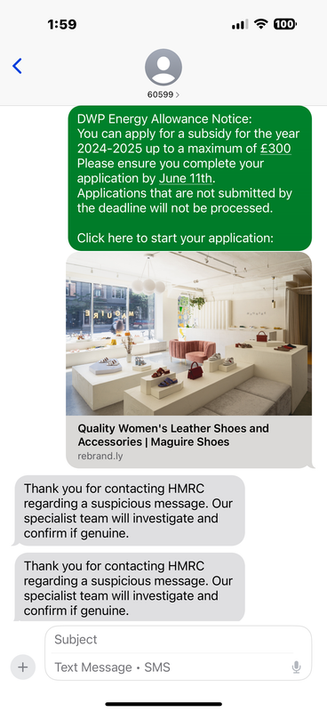 I had a text message ping up earlier this morning, purportedly from HM Department of Work and Pensions, warning that if I didn’t apply by June 11, I would miss the deadline. I opened the link, and while the page looked authentic, a section asking for bank and card details set my spidey senses tingling. My first search brought up a Daily Express article warning about it, and giving a text number to forward the message to, which I’ve done.
