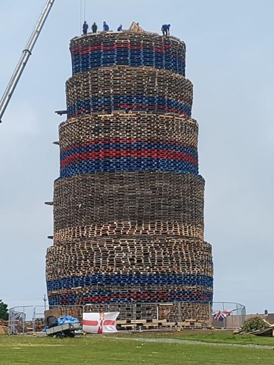FYI, that's a different bonfire that's been dismantled - the article is somewhat misleading in that it shows a picture of the bonfire in Larne but is reporting on the dismantling of one in Bloomfield in Belfast. The article does mention at the bottom that the picture is from Larne.