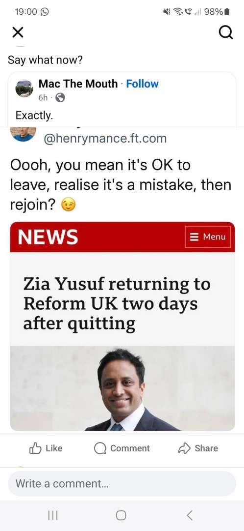 Zia is back but not as chairman. He is going to be heading Reform's "DOGE team".
