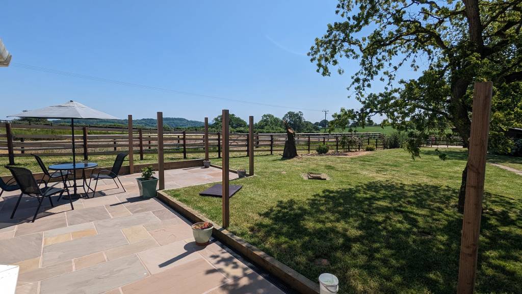 I like a good project and I've also got short arms and long pockets, so i had a crack at laying a new patio here. Roughly 65mtr2 indian sandstone with sleeper borders, decent fall into a channel drain, plus cable ducting underneath for lighting.