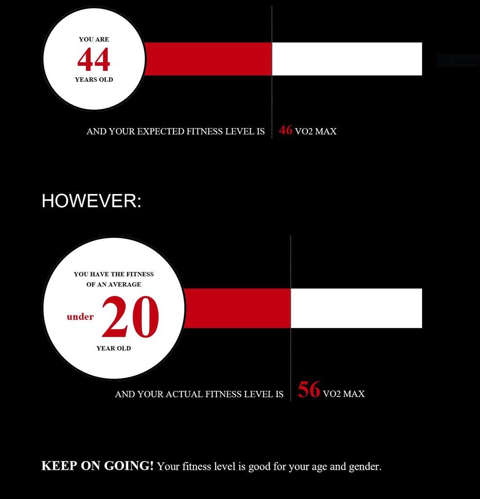 According to that survey I'm 48 but have the fitness of an average 23 year old, with a VO2 Max of 55.