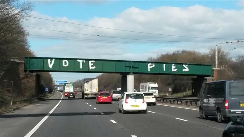 A few weeks or so back a bridge in that area, possibly the same one (green?), had 'vote pies' written across it on the south side visible when travelling north bound.