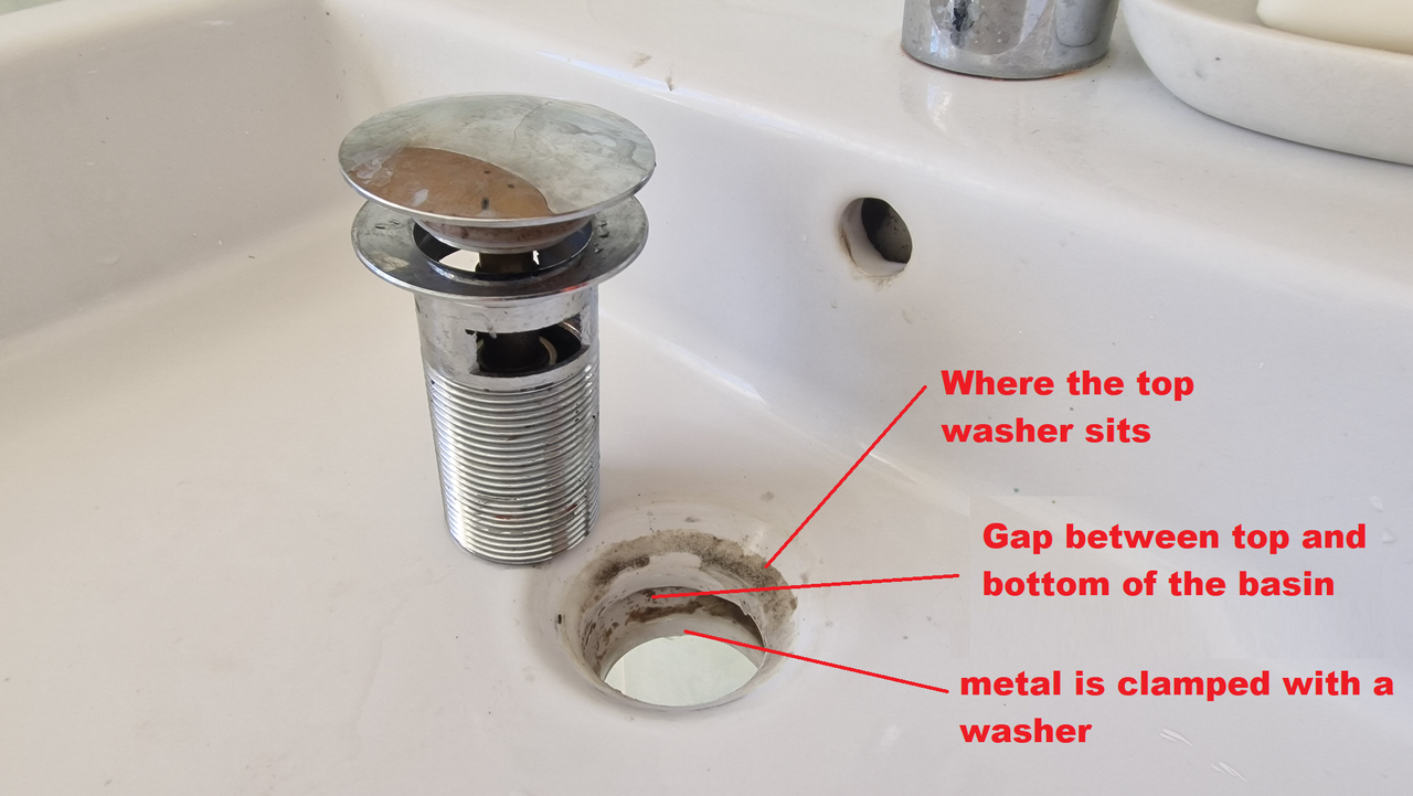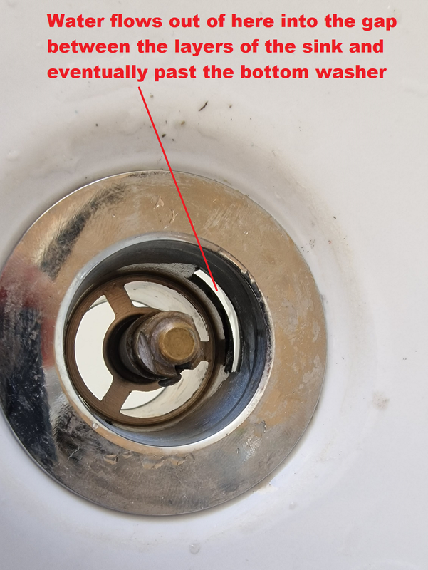 It is a pop top plug thing which works fine and allow the sink to be filled or drained (slowly) but part way down the neck of the drain is a hole. This sort of lines up with the gap between the two layers of the sink but is not level with the bottom layer so any water that goes through the hole just sits there, outside of the metal tube. This eventually finds away past the bottom rubber washer and leads to the drips.