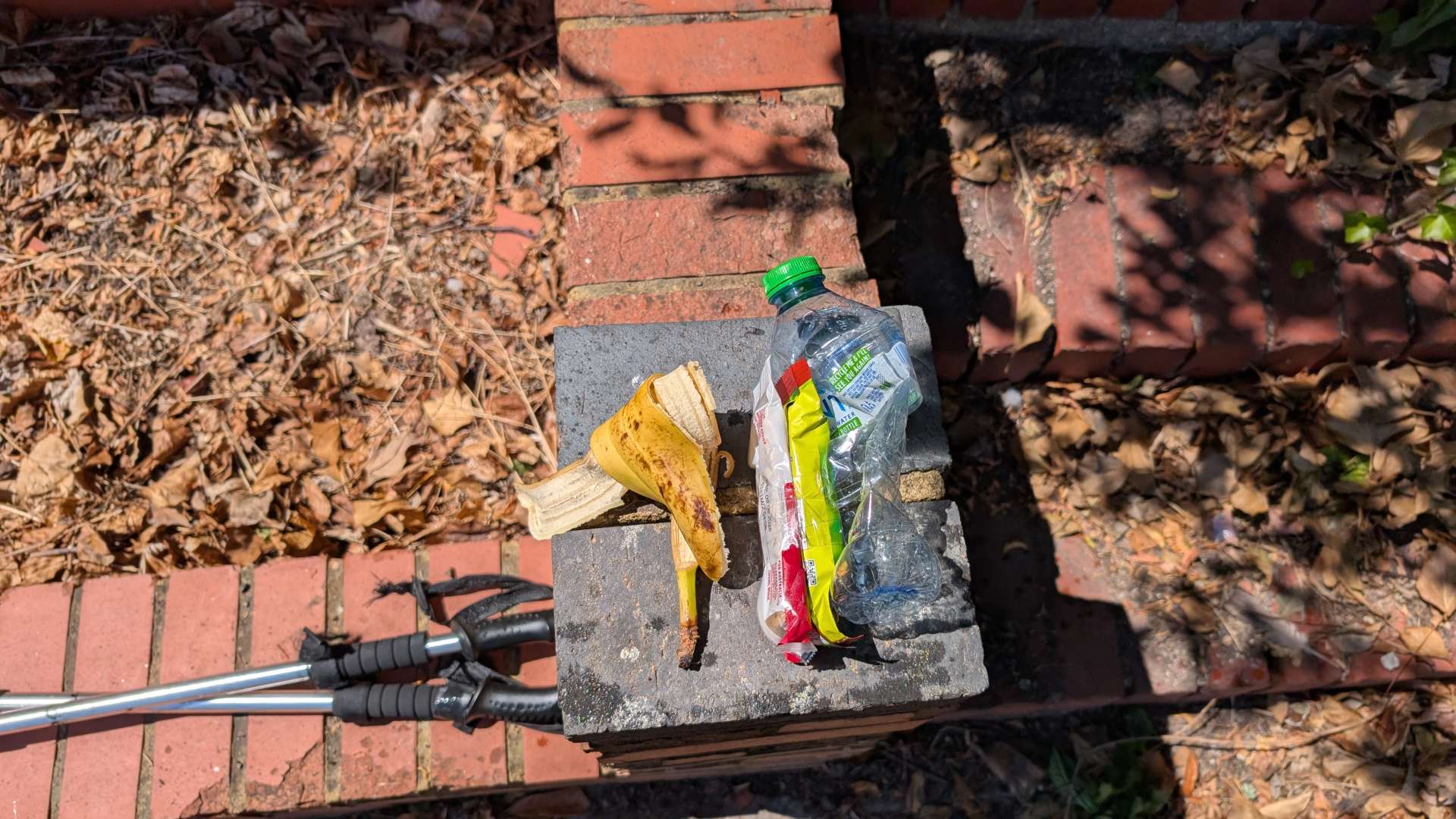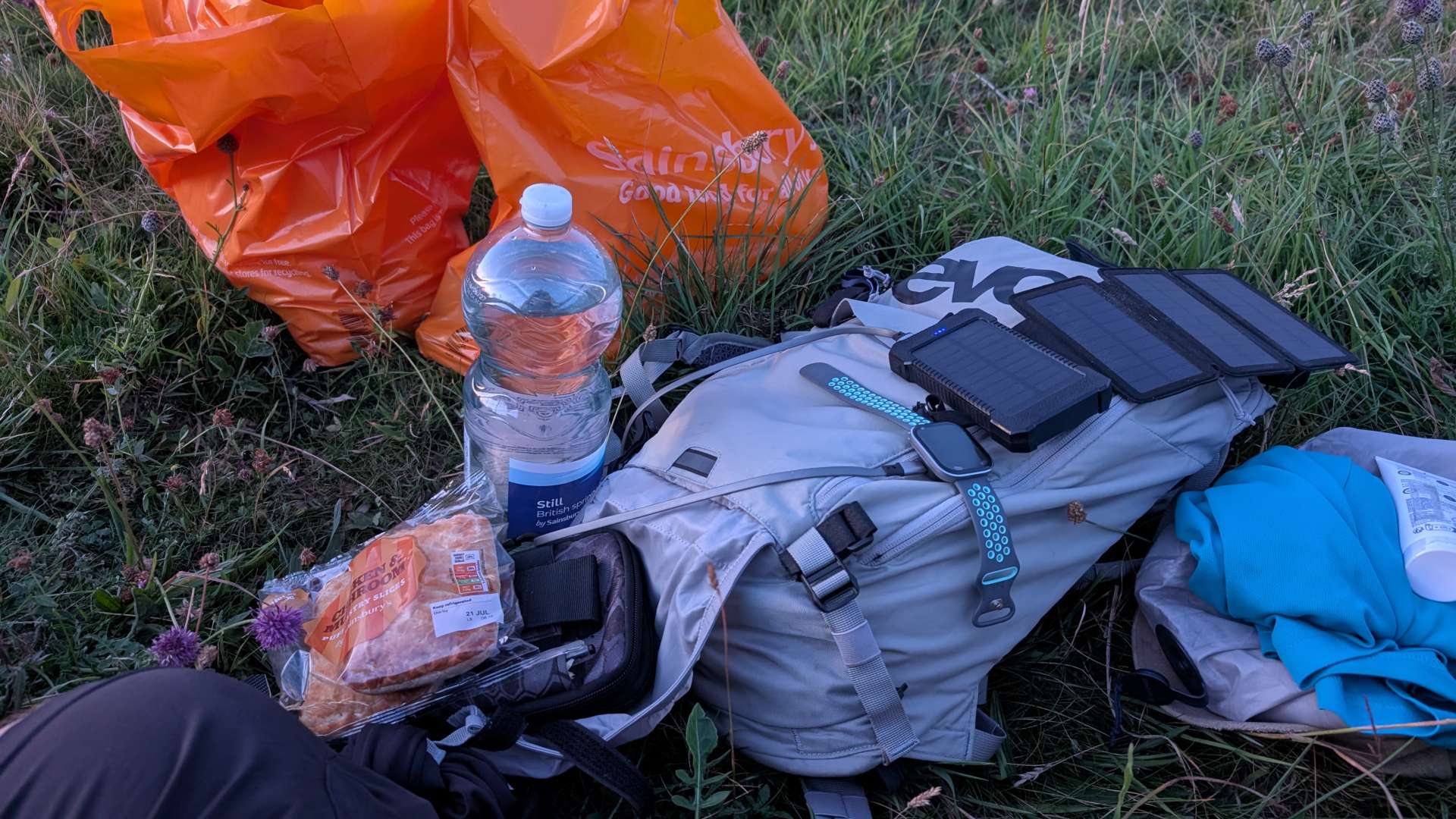 On the top, that's a power bank and solar charger. The white bag is rubbish, not passed a bin yet.