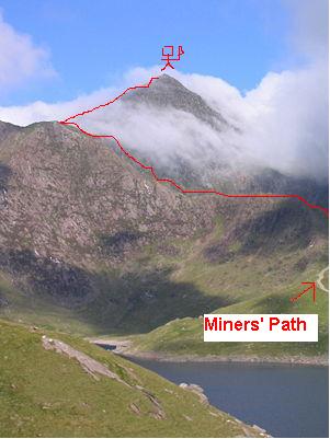 Now a connoisseurs route is to follow the Miners' Path to the outflow of Glaslyn then turn 90 degrees left and scramble up the compact but largely forsaken Y Gribin ridge, followed by Snowdon's rather loose East Ridge that overlooks the huge Trinity face, straight to the summit, then return over Grib Goch. It rocks.