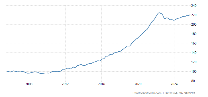Ok ta for info, I heard German prices had been static it was on a finance pod. My 2 German friends think we in uk are mad with our obsession 're property, they rent their landlord is an insurance co so they may stay all their lives in the same properties.