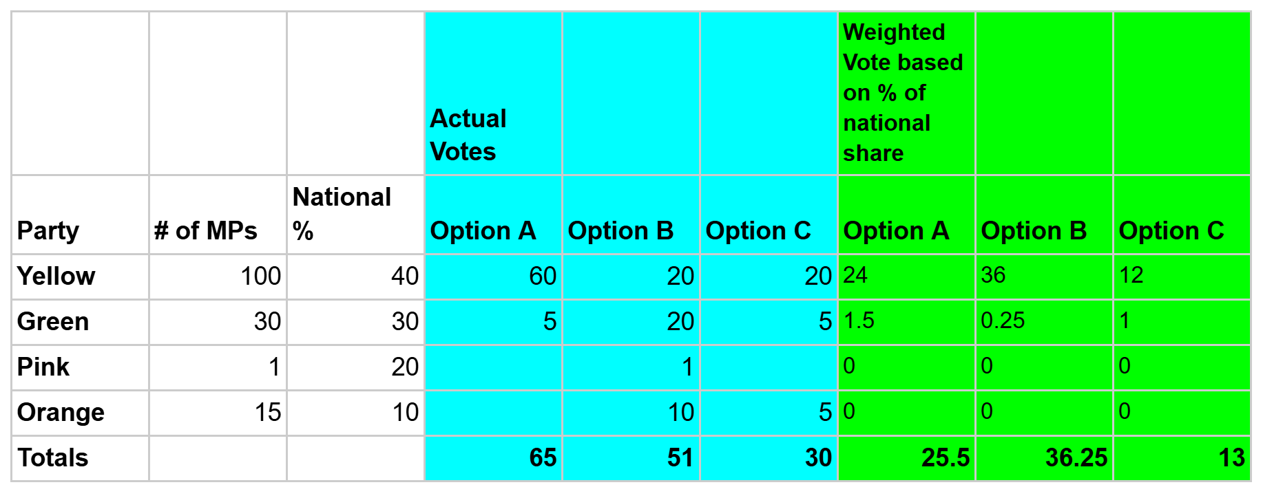The table shows an example where one party (Yellow) got loads of MPs but only 40% of the overall vote whilst another party (Pink) only managed 1 MP with 20% of the national vote. There is then a vote with options A, B and C for the MPs to choose. In pure numbers of votes Option A wins but with the proportional weighting applied Option B wins.
