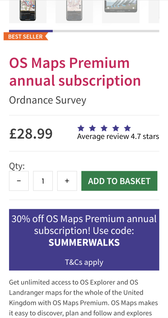 Good price however having used it for a year, now much prefer Outdoor Active app (formally ViewRanger) which also features OS maps and isn’t much more money.