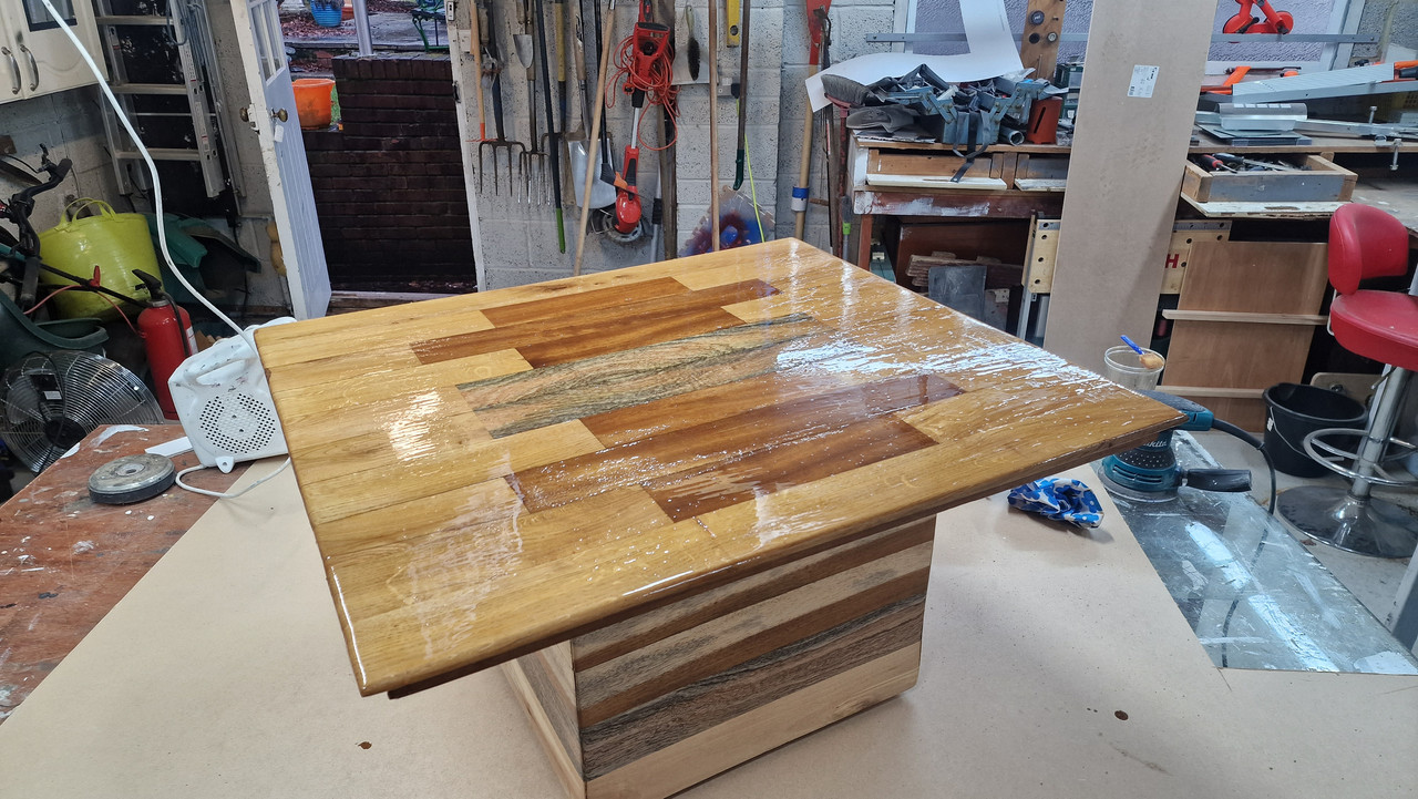 While I was being a domestic hero I thought I would sand and revarnish the coffee table I made last year to remove the deep scratch that 'no-one' made over Christmas. This is it after a quick sanding, with first thick coat of varnish to hopefully better protect it. I will be sanding this back level and then applying 1 or 2 layers of thinned varnish to hopefully give a smoot and bubble free finish.