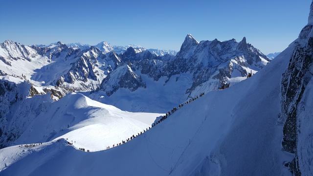 Best way down to avoid the que of the arête is to go under the cable car across the valley, but obviously make sure you know what your doing at that point !