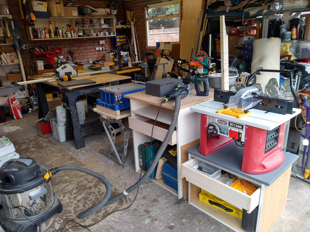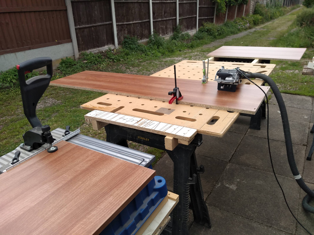 For my main woodworking, which is mostly tracksaw based I use a couple of Stanley folding sawhorses which are notched to take 38 x 63 CLS timber. I plonk a board on top of the timbers to work on. Depending on the job I either use 2.4 metre studs or short cut down ones. My big board is a full 1500mm x 900mm MFT top.