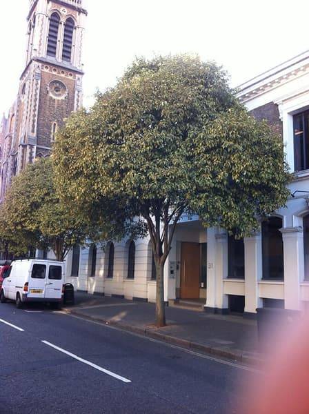 We have a Bristol Whitebeam (4m wide canopy, 5m tall, lovely leaves. Also have a Chinese Privet that is your classic lollipop tree, evergreen, 5m tall and 6 metre wide canopy (has gone a bit feral).