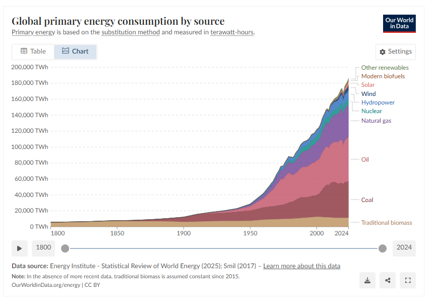 Indeed. Despite the positive sounding story, fossil fuels are still the primary source for energy with coal and oil (along with gas) remaining the three largest sources by far.