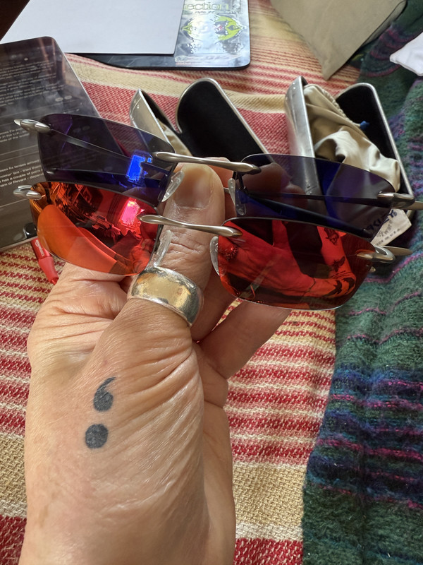 Here’s my two pairs of WHY 4 glasses, the blue ones are the oldest, the red ones are a second pair I managed to find on eBay, as a just-in-case backup pair, but I wear both, depending on mood, and the lenses are a slightly different colour tint when wearing them. I love them, they weigh virtually nothing.