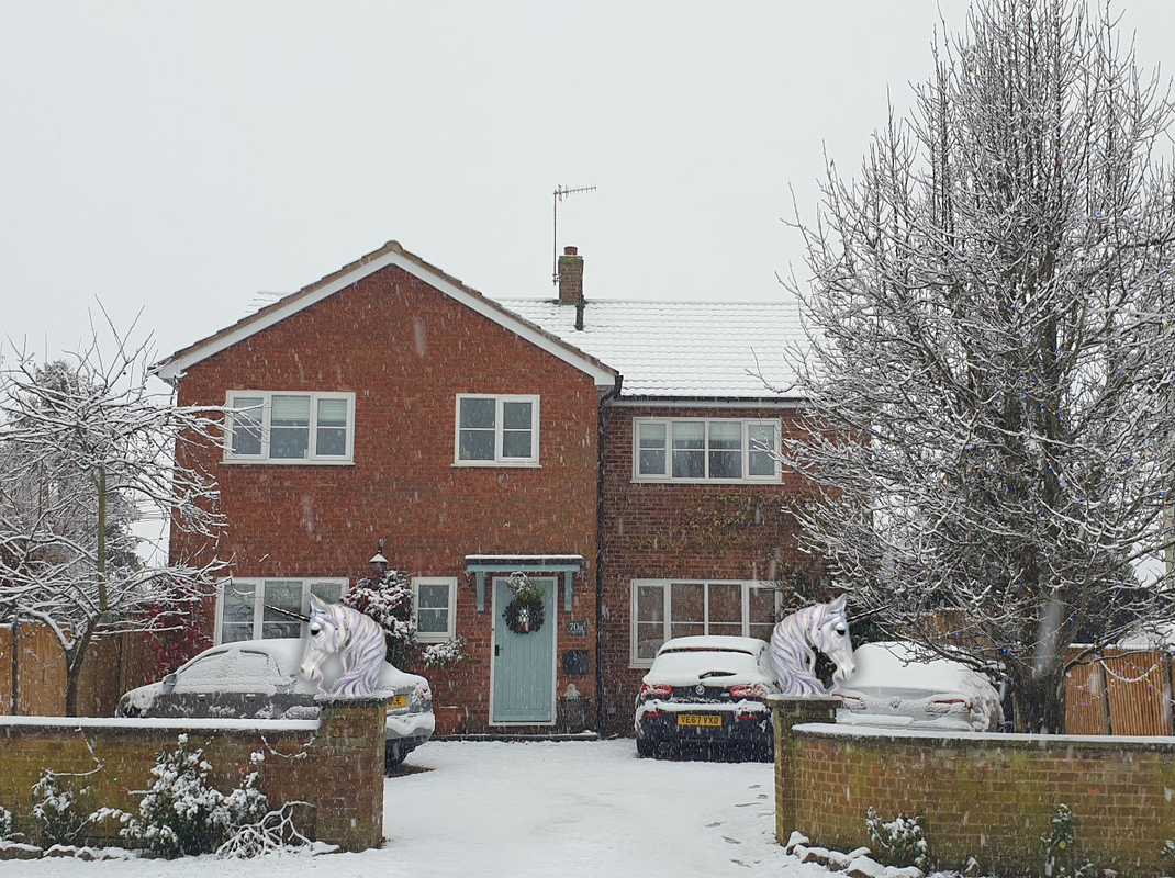 I thik if you go full unicorn you need to have them facing the other way and up on their hind legs like an arch.