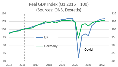 This is based on a Mark Carney quote and it is wrong, UK and German growth since the Brexit vote has been pretty much the same.