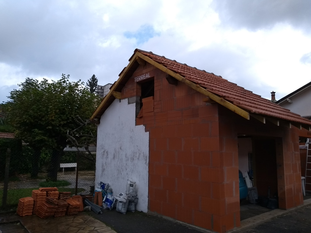 Yeah I know that's a lot of bricks around the window opening, I ran out of full "brique poteau" with holes for the steel reinforcing so had to use multiple 1/3 bricks. Oh and the reinforced concrete along the top of the gable end bricks has only been done on one side. The weather was about to break so I put the roof on quick and will have to take a bit off again to finish that. Can't think of anything else that will confuse some north of the border.
