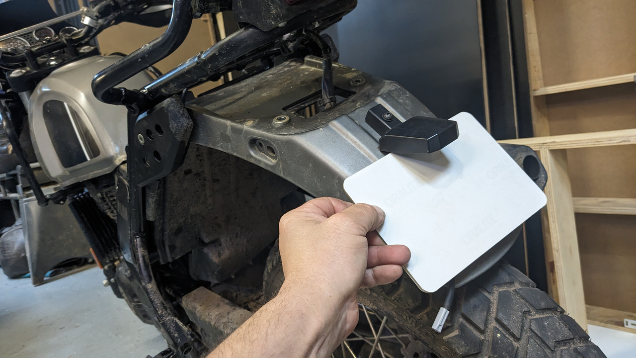 Approx 10mm rubber spacers between the plate and the fender to stand it off from the numberplate light wire that's laying behind the plate.
