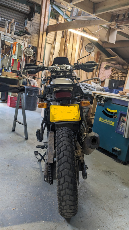 His Himalayan was absolutely awesome looking. Big knobblies, loads of navigation stuff, single high front guard etc. Sounded mint too with a Lextek pipe.
