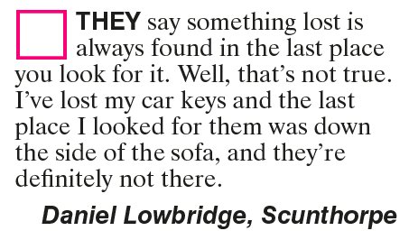 After I left home I went back to my parents home to collect a book. I walked straight to the book case and browsers for the book. I then couldn't find my car keys. Despite knowing they were in a space 3 feet by 3 feet it took hours to find my keys. Next to the book cases were 3 stacking boxes of papers. The keys were at the bottom of the bottom box. You just got to keep looking