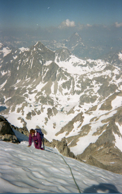Someone asked for pics. Here's an old one with a 10m rope, 😉 moving together and I'm happy because whatever she does she's not going anywhere. I've reached the ridge where it's gradually flattened out and asked her to stop for a rest and pose for a pic. The were some very short precarious sections over a big drop on the ridge that followed, not difficult but a slip/trip/topple would have been a long fall - a risk avoided with a short rope and a stance. In fact the guide suggests an ice axe and short rope - we did it very early season when there was more ice and snow so used crampons too.