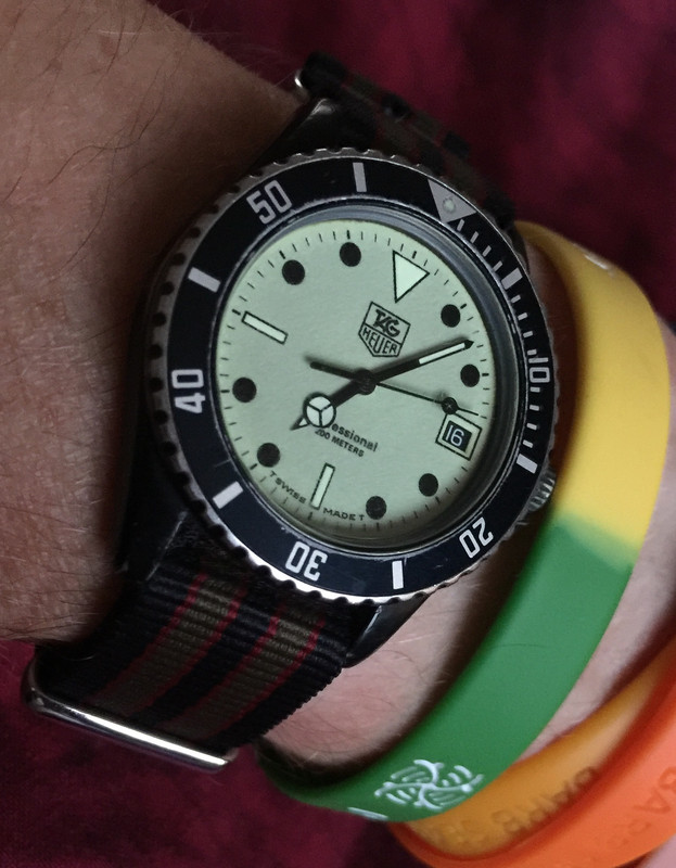 I hate those rubber straps, they bring me out in a rash, they get grubby and smell pretty quickly. I prefer stainless steel mesh ‘sharkskin’ bracelets, thick leather or NATO/ZULU nylon straps. I noticed in one photo a watch with a black and grey striped ‘James Bond’ NATO strap - the actual James Bond strap is a nylon strap with nylon keepers, the NATO strap wasn’t issued until after the Bond films came out, and it’s a three-colour strap, dark blue with olive green stripes and thin red stripes separating them. Looks really good, dark rich colours that suit sports watches pretty well. There’s a case to be made for putting one on a Seiko, because Roger Moore wore Seiko watches as Bond. This is my TAG Series 1000 with one fitted, Dalton wore one, only with a steel bracelet. But who cares about small details like that. 😬