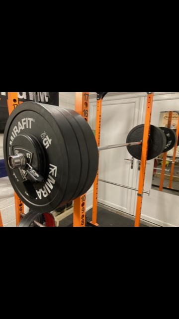 Pretty basic. Bench, squat stands, some weights. But also needs space for a yoga mat and turbo trainer.